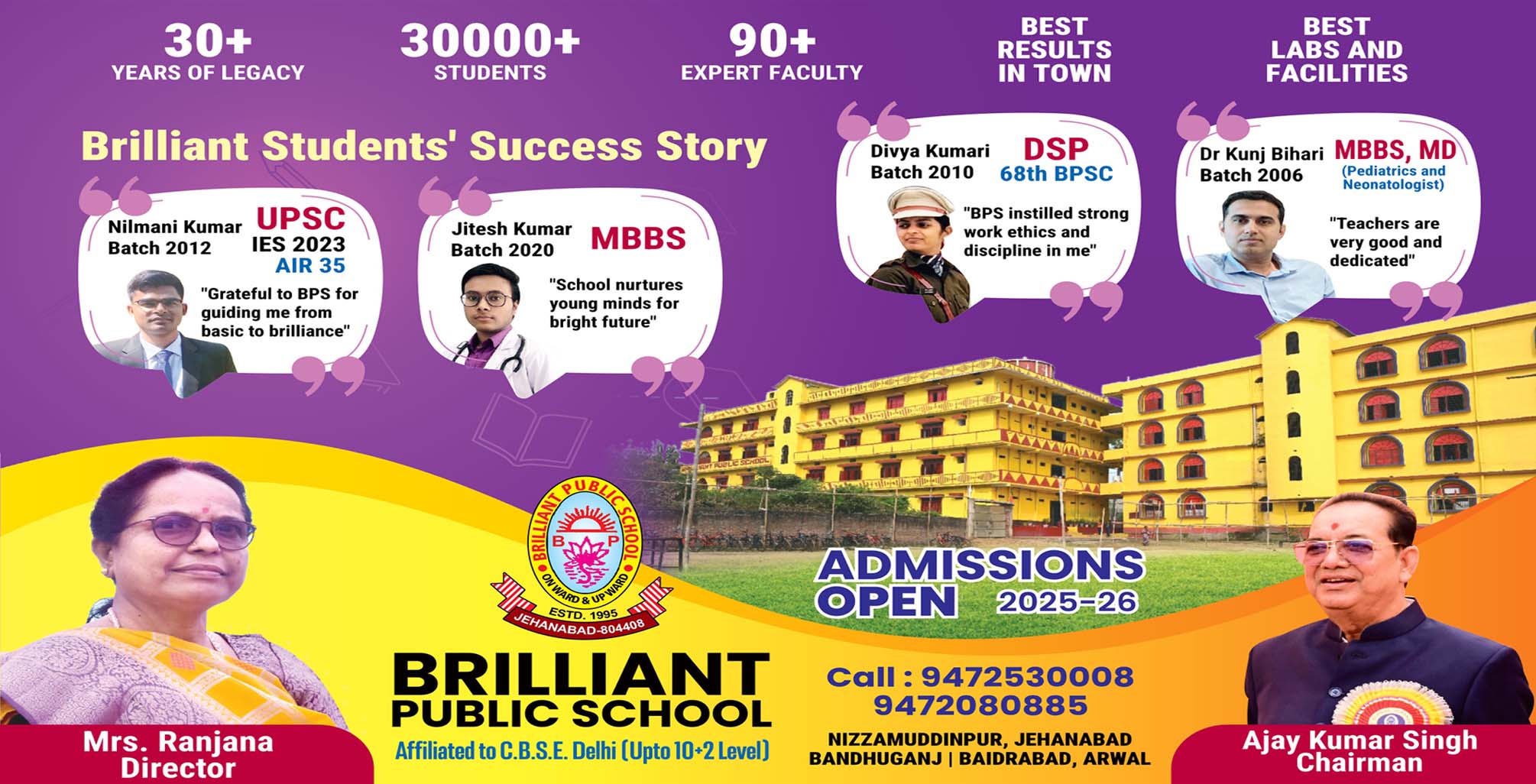 Brilliant Public School,Nizamuddinpur,Jehanabad was established on 27th November,1995 with a motive to impart all round- holistic education of best standards to the students.The School is run by a group of very experienced and qualified professionals who are committed to provide a congenial environment for the future generations to blossom.Marking it's 30th year of successful and eventful existence ,School pledges further to keep evolving and provide state of the art facilities to students to help them excel , affordably.The school boasts of state of the Art -Physics,Chemistry,Bio and Computer labs and carefully curated expert team of Faculty to handhold students to progress.The School is a co-educational English Medium senior secondary School affiliated to CBSE till Class XII. It is managed by A Brilliant Charitable and development trust, Jehanabad, registered body under the Indian Trust Registered Act with eminent educationists and Philanthropists.More than 30000+ students have passed out from the school and are active in different professional fields of India and the world .The Trust also has 2 other sister schools running by the name of BPS in Bandhuganj, Baidrabad (Arwal)Read More